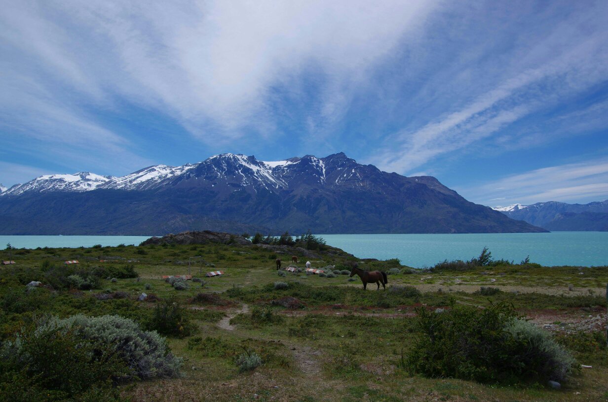 Il est 8h, le soleil est déjà au rendez-vous quand nous partons rejoindre notre bateau pour traverser le lago O Higgins. Les montures des cyclistes sont déjà attachées à l’avant du bateau quand nous embarquons, quelques minutes plus tard, nous voguons vers l’Argentine sur l’incroyable bleu émeraude du lago…